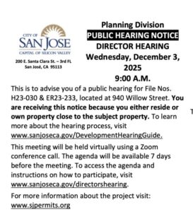 The application for a Site Development Permit for the 940 Willow Street Residential Project (File Nos. H23-030)has been scheduled for a Planning Director’s Hearing on Wednesday, December 3, 2025 at 9:00 AM via Zoom.